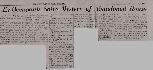 In the days that this story took place, August of 1968, a man named Robert J. LaFortune (later mayor himself and grandfather of our current mayor) was Tulsa’s Streets Commissioner. His are my favorite quotes in the newspaper stories (sorry, Dad). In the first story about the unidentified house: “ ‘You mean it has been sitting there for months?’ demanded Robert J. LaFortune, commissioner of streets and public property.” The second story identifies the Owasso couple who bought the house and who had been trying in vain to find a mover, any mover, to pick it up and bring it to them, and notes that they had now been in touch with the commissioner. LaFortune’s response: “‘We’re going to have to do something about it,’ he said, darkly, today.”